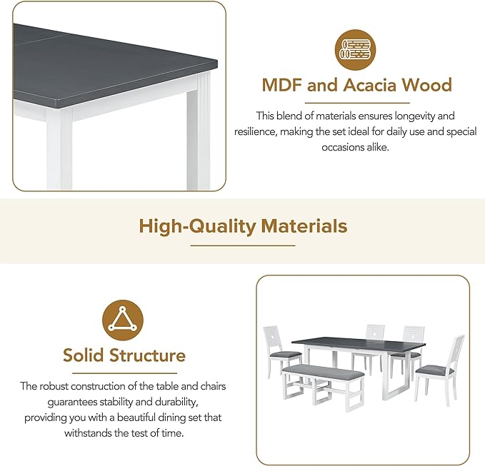 6-Piece Farmhouse Wood Extendable Dining Table Set with 18" Butterfly Leaf, 4 Upholstered Chairs and Versatile Long Bench, for Kitchen Room Furniture, Dark, 60"-78"L x 36"W x 30"H, White+Gray