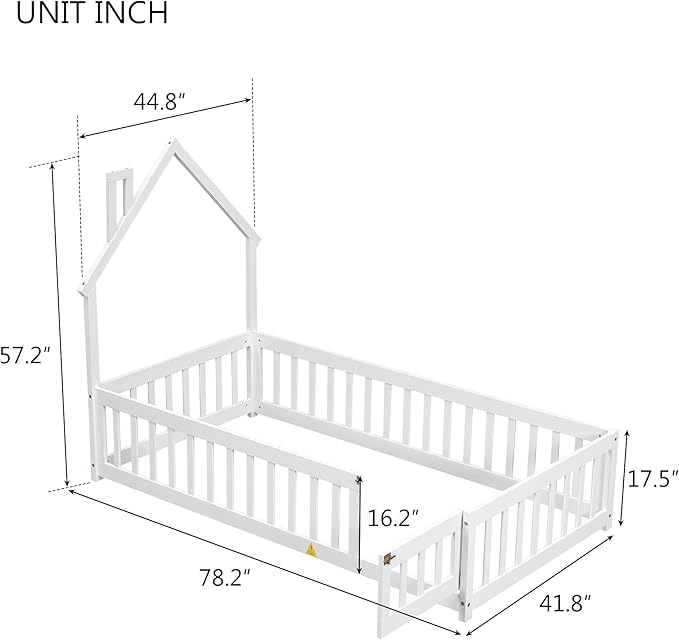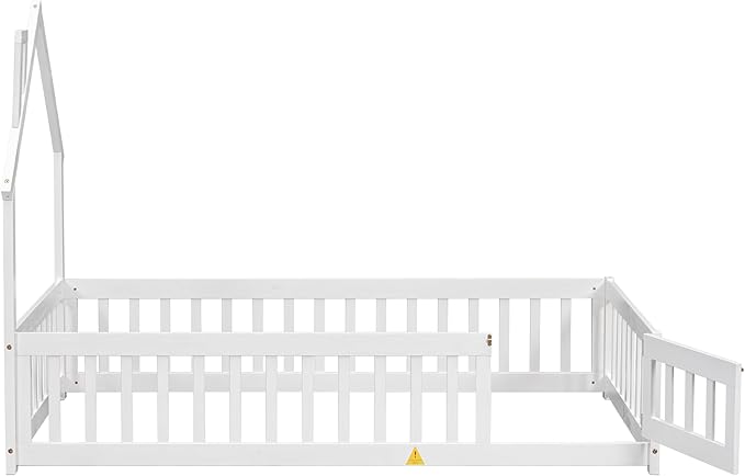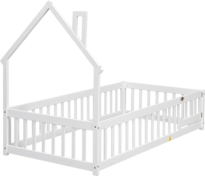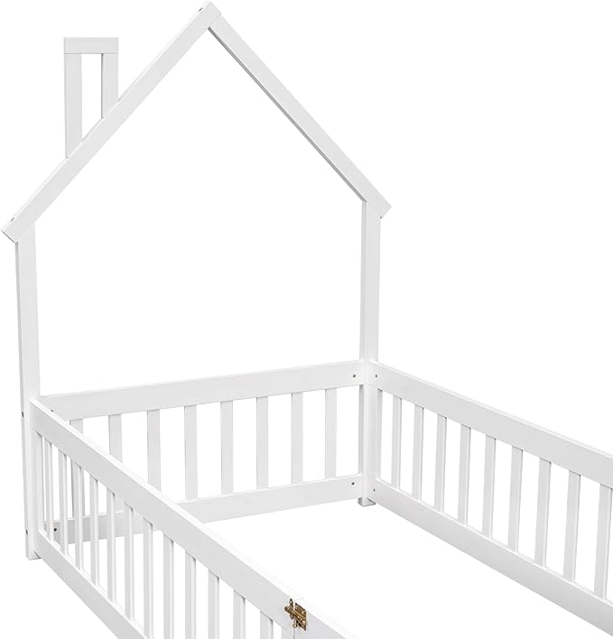 Twin Size Kids Montessori Floor Bed,House-Shaped Headboard Floor Bed for Kids,Floor Bed with Fence and Door,House Bed Twin Frame for Girls,Boys(Twin,White)