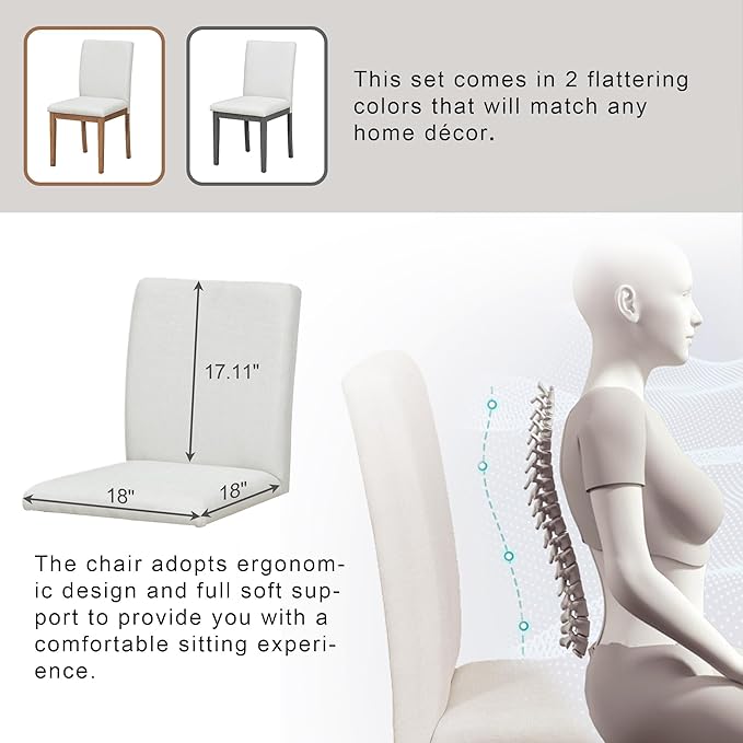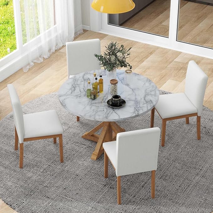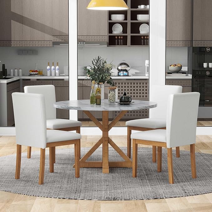 5-Piece Farmhouse Wooden Round Dining Table Set with Marble Sticker Tabletop and 4 Linen Upholstered Chairs for Dinette Room and Kitchen (47.2 inch,White+Walnut), 47.2" L x 47.2" W x 30" H