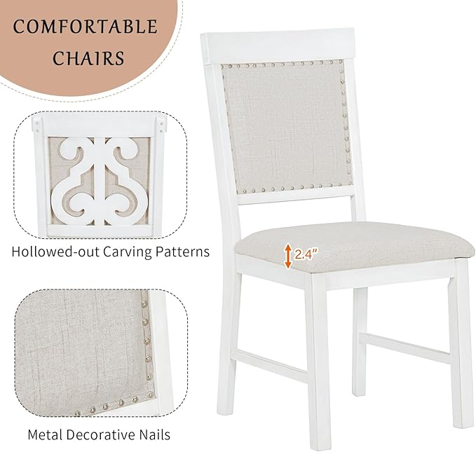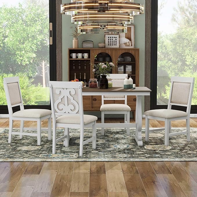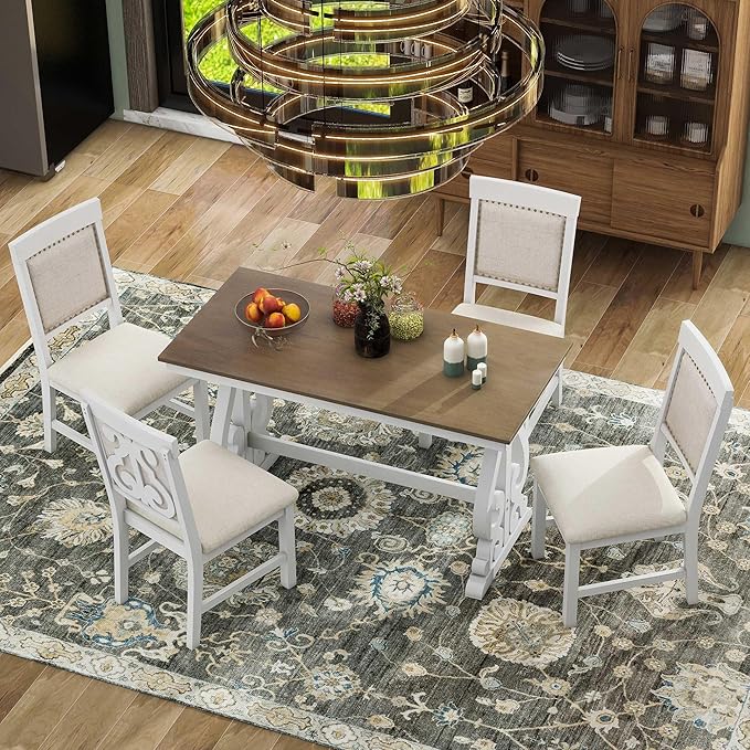 5-Piece Retro Style Set with Unique Legs and Backrest, Rectangular Wooden Dining Table and 4 Upholstered Chairs Furniture for Kitchen Room, Brown+White, 52" L x 26" W x 30" H
