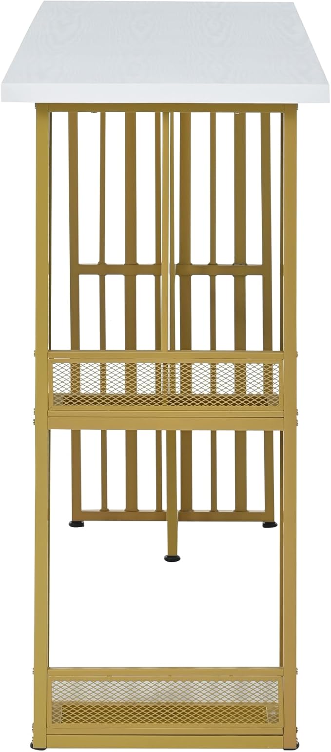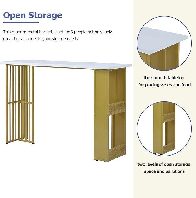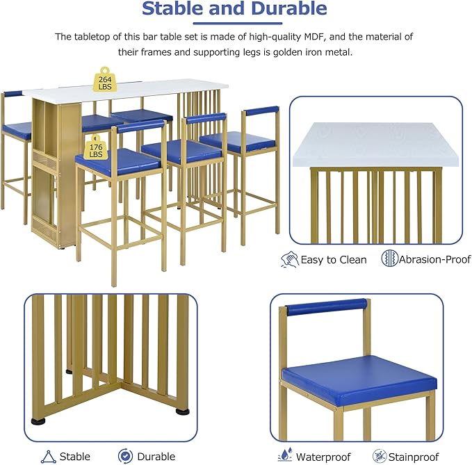 7-Piece Multi-Functional Modern Counter Height Dining Bar Table Set with Open Shelves and 6 Upholstered Stools with Gold Metal Frame for Home Pub Kitchen Room (White+Blue)