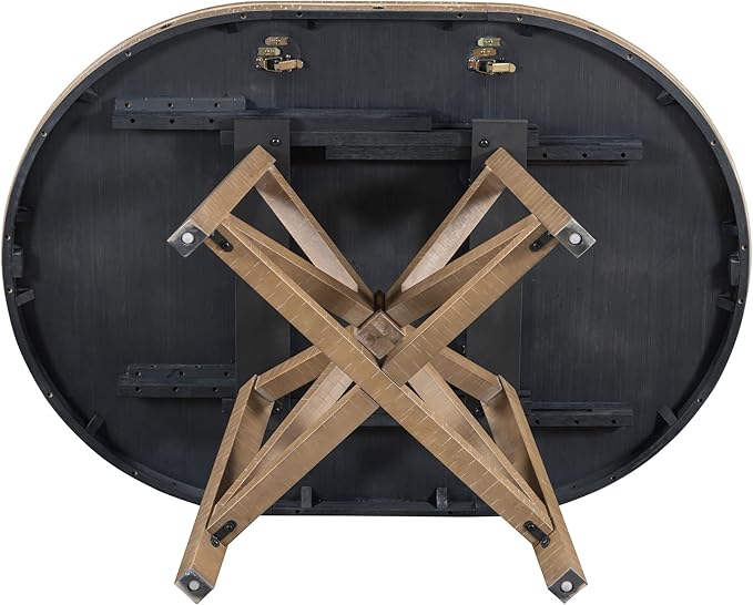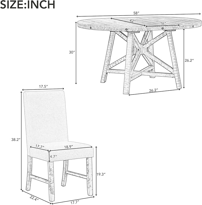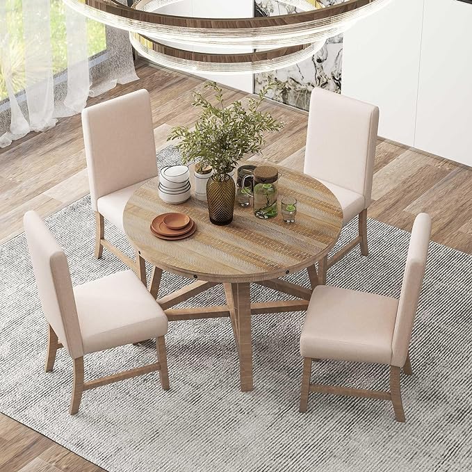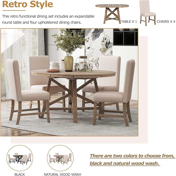 5-Piece Retro Wooden Round Extendable Dining Table Set with 4 Upholstered Chairs for Dinette Room and Kitchen (42", Natural Wood Wash), 42"-58" L x 42" W x 30" H