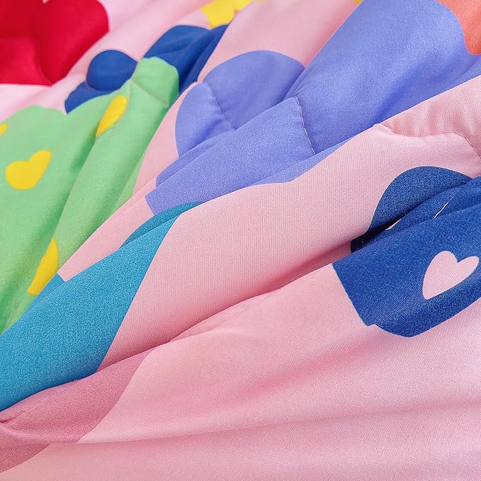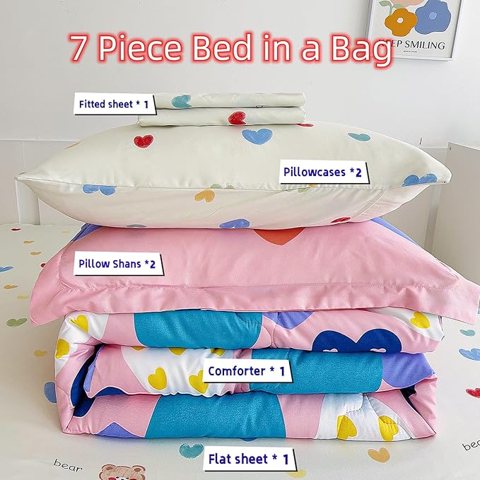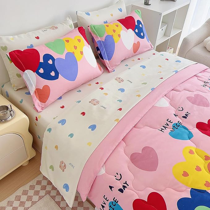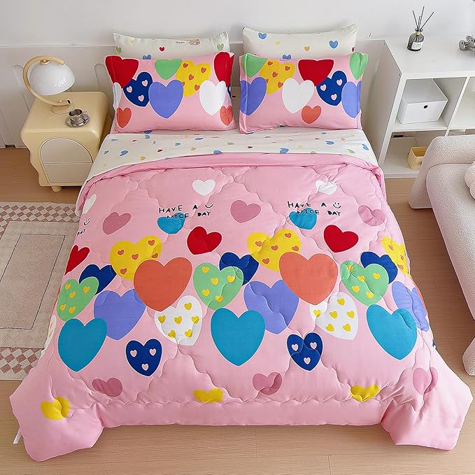 7 Piece Kids Pink Heart Bedding Sets Twin Comforter Set with Sheets - Colourful Reversible Heart Shaped Cute Bedding for Girls Kids - Love Quilt Bed in a Bag All Season