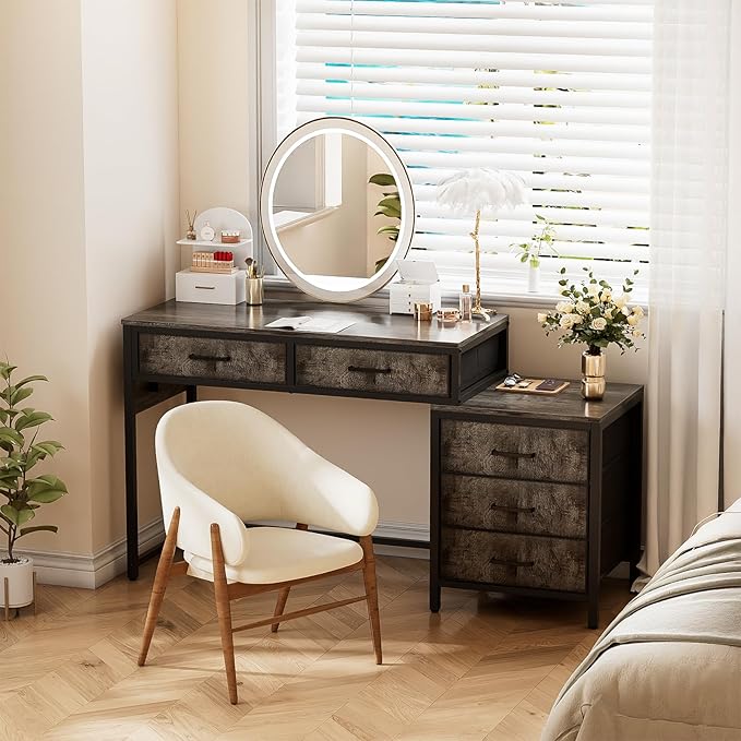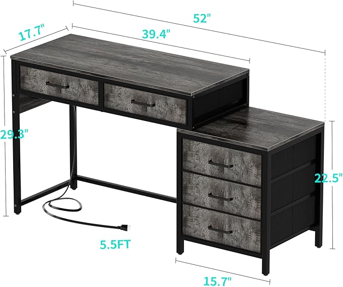 Unikito Computer Desk with 5 Drawers, Reversible Home Office Desk with Power Outlets, Sturdy Writing Desk with File Cabinet and Printer Stand, Vanity Desk with Storage for Small Space, Black Oak