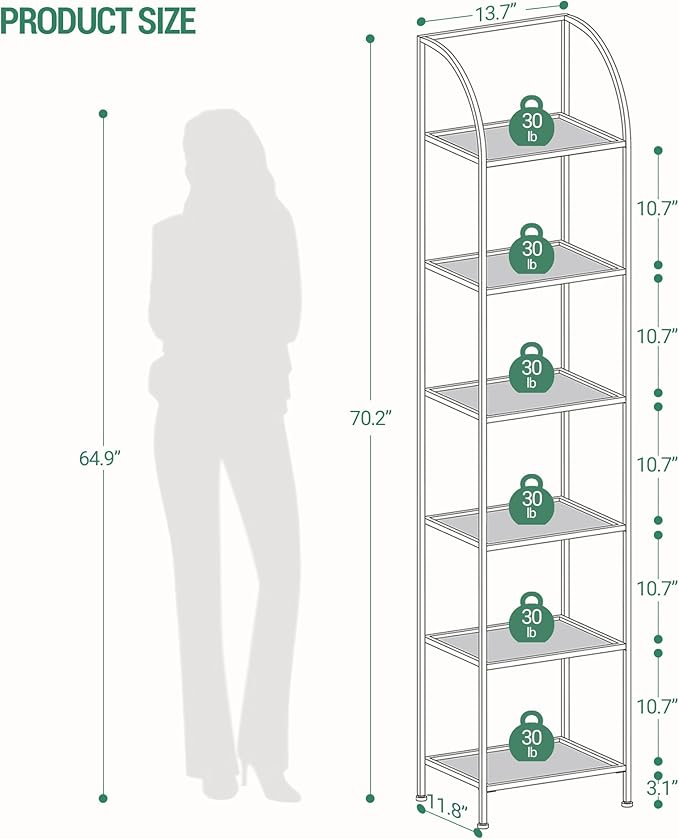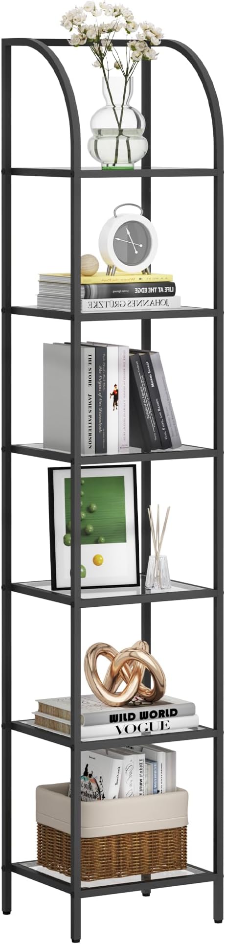 Bookcase Bookshelf, Tempered Glass Arched Bookshelf for More Storage, Slim Shelving Unit for Bedroom, Bathroom, Home Office, Steel Frame, 6 Tier Black BC20699B
