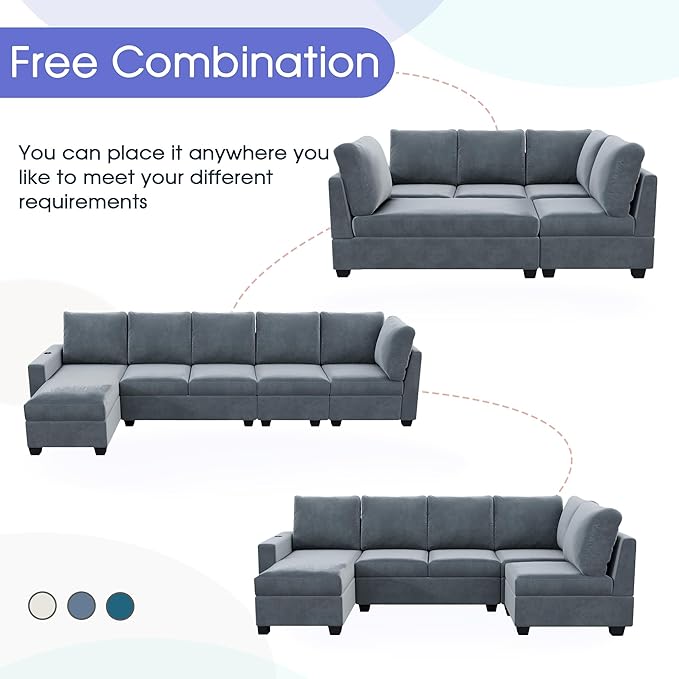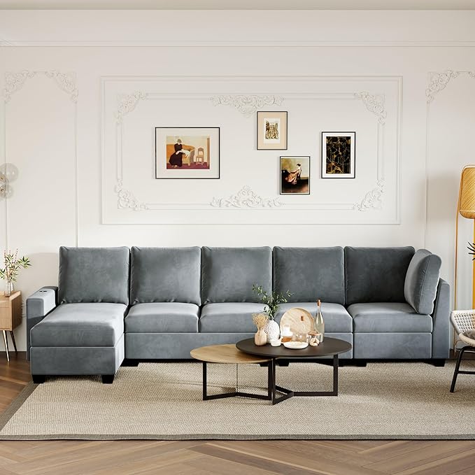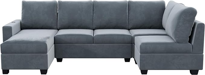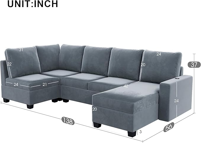 138" Convertible Sofa Velvet U Shaped Couch with Reversible Modular Sectional Sofa&Couch 6 Seater with Chaise Lounge,Freely Combinable Indoor Furniture for Living Room, Apartment, Grey-A