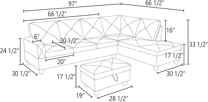 About This L SHAPED SOFA: 897 "W x 66 "D x 33 "H; Seat Height: 16", Seat Depth: 20". Modern...