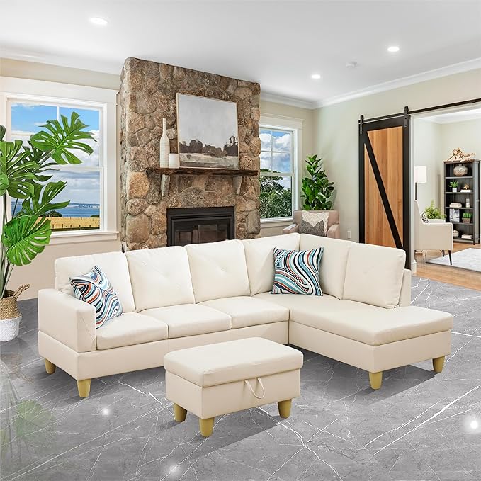 Faux Leather L Shape Sofa, Modern Sofa&Couch for Living Room,5-Seat Comfy Sectional Sofá Corner Couch Set with Wide Chaise for Bedroom,Office, White