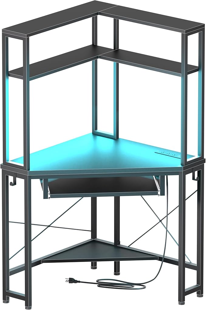 Corner Desk with Hutch and LED Lights, Corner Computer Desk with Keyboard Tray and Monitor Stand, Small Computer Desk for Small Spaces, Home Office