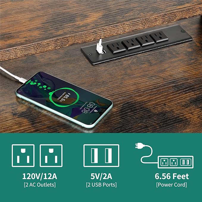DWVO Computer Desk with Drawers & Hutch, 59.1" Office Desk with Power Outlets & LED Lights, Home Office Desk with Storage Shelves, Rustic Brown