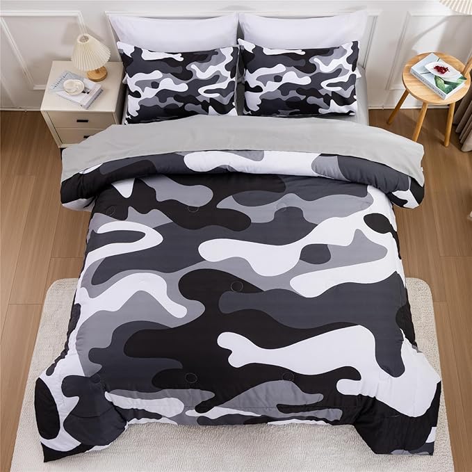Meeting Story Camouflage Bedding Set, Colorful Pattern Style Comforter Set, 5 PCS One Comforter Two Pillowcases Two Sheets in One Bag, All Season Bedspread for Teens Adults (Grey,Full5pcs