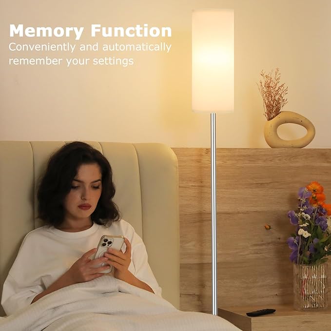 Ambimall 64'' Floor Lamps for Living Room with Remote Control and Stepless Dimmable Colors Temperature & Brightness, 9W Bulb Included(White Lampshade & Silver Pole)