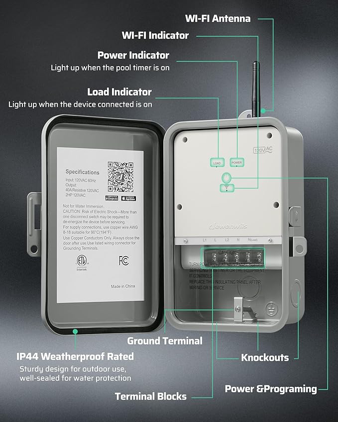 DEWENWILS Pool Pump Timer, Outdoor Smart WiFi Box, Heavy Duty 40A 120VAC 2HP Wireless Controller Timer for Pool, Water Heater, Compatible with Smart Phone, Alexa, Google Assistant, ETL Listed