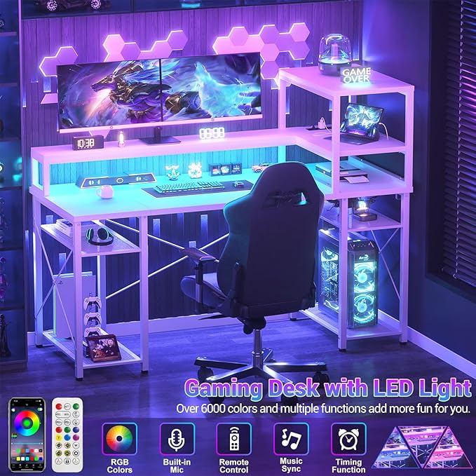 Cyclysio 55 inch Gaming Desk with LED Light, Adjustable Computer Desk with Storage Shelves, Home Office Desk with Power Outlets, Computer Gaming Desk with Long Monitor Stand for Small Space, White