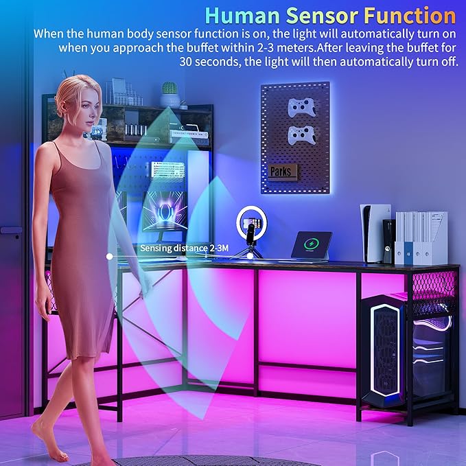 Lvifur 67” L Shaped Desk with Wireless Charging Station,24-Color RGB Dimmable Computer Desk with Pegboard,Gaming Desk with Monitor Stand, Display Stand,Human Sensor Lights for Home Office