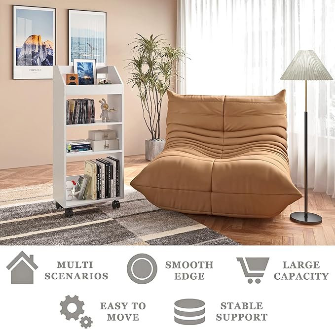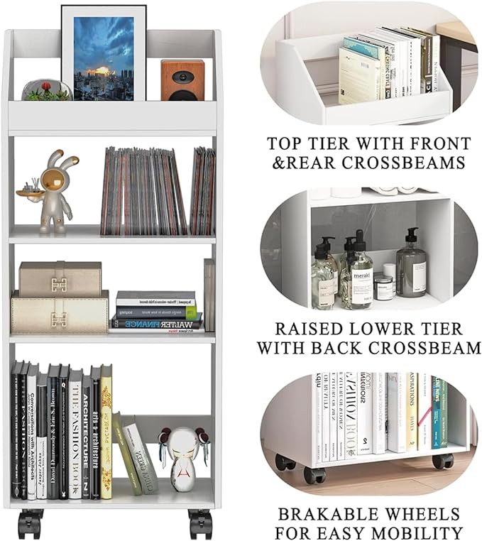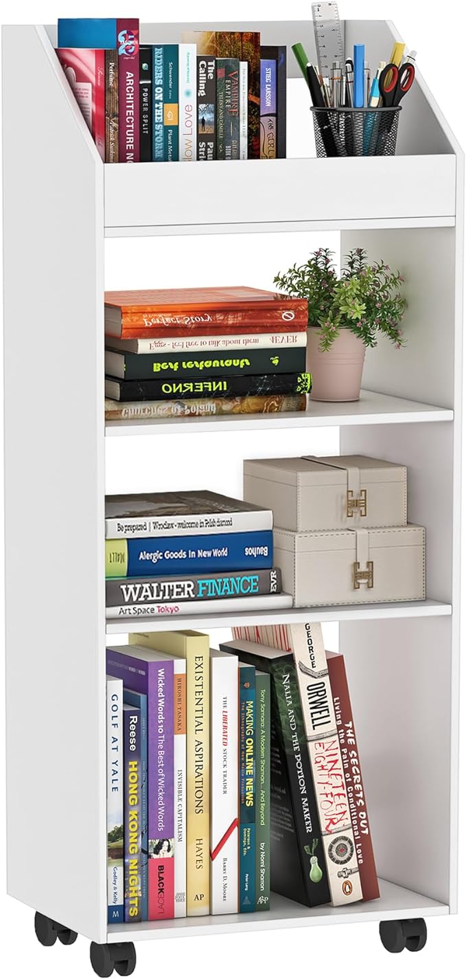 4-Tier Mobile Bookshelf, White Bookcase with Wheels, Rolling File Holder Desk File Book Organizer for Home Office Living Room School