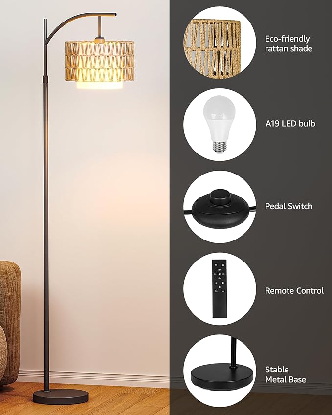 Boho Arc Rattan Floor Lamp with Remote Control - Tall Standing Lamp for Living Room, Mid Century Farmhouse Floor Lamp, Adjustable Height and 360° Rotation for Bedroom, Study Room