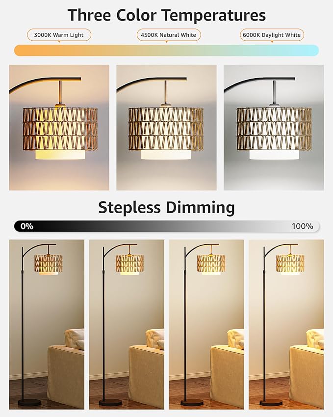 About This 【Dual Lampshade Design】Combining a handwoven rattan lampshade and soft fabric lampshade, this floor lamp is perfect for diverse...