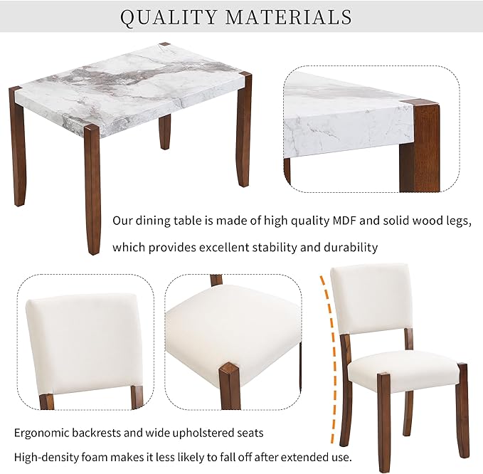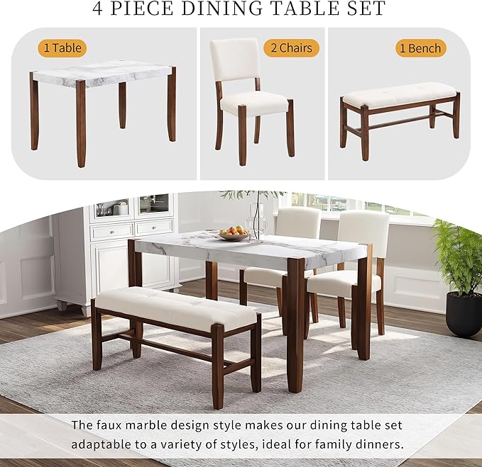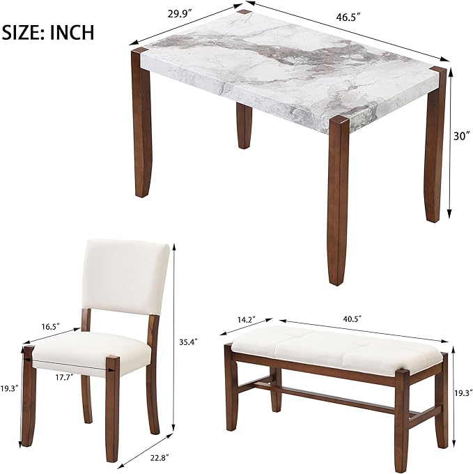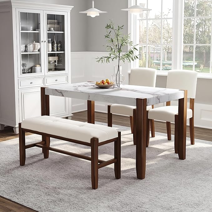 NicBex Dining Table Set for 4 Kitchen Table Set Modern 46" Faux Marble Style Table and 2 Upholstered Chairs & Bench with Wood Legs for Kitchen, Space-Saving, Off White