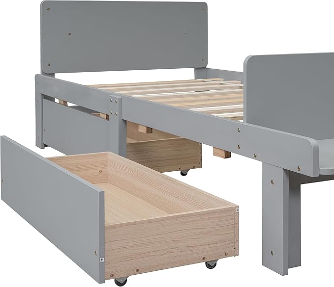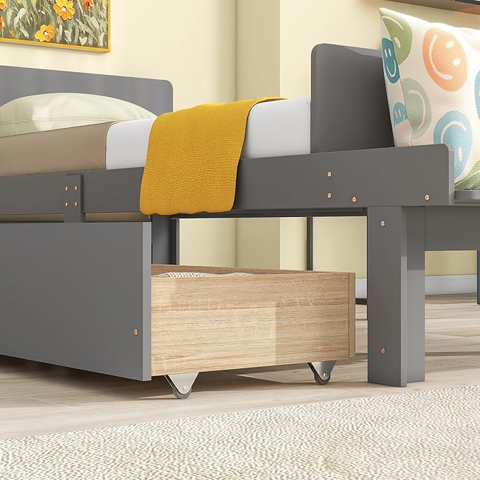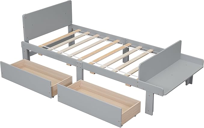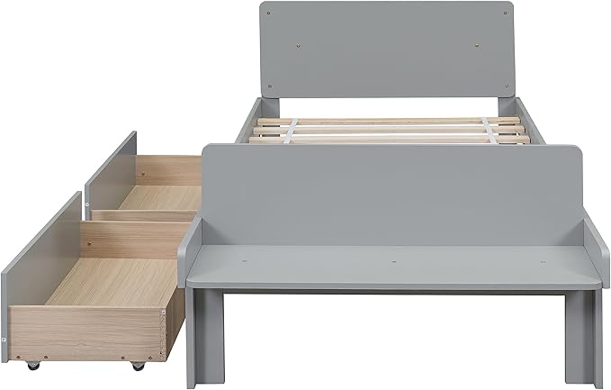 Twin Bed with 2 Drawers,Storage Platform Bed with Footboard Bench and Headboard,Pine Wood Twin Size Bed Frame High Stable for Kids,Boys,Girls,Teens, No Box Spring Needed,Grey