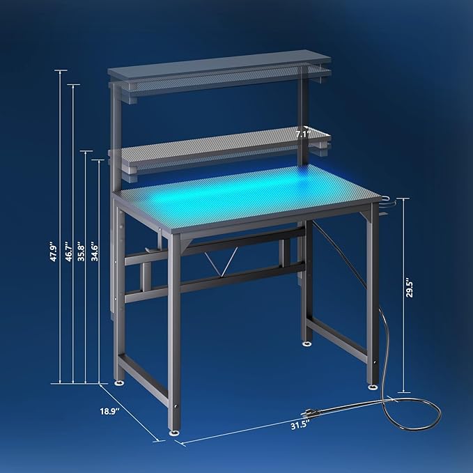 Gaming Desk with Power Outlets & LED Strip Lights,80CM Industrial Writing Desk with Adjustable Monitor Stand, Cupholder and Headphone Hook for Home Office Black