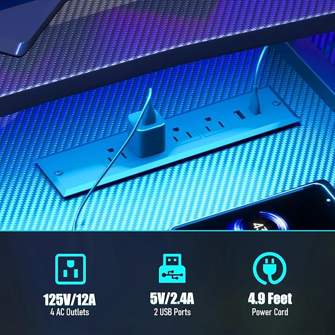 Gaming Desk with Power Outlet&Led Lights, Computer Desk with Monitor Stand and Open Shelf,Gamer Table Workstation with Cup Holder, Headphone Hook, 2 Speaker Stand for Home Office