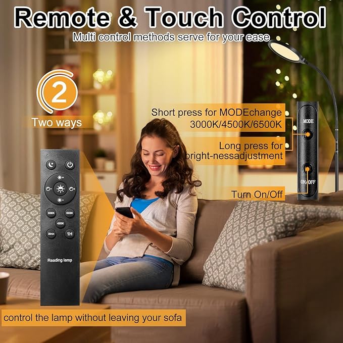 • 【Remote & Touch Control】Our LED standing lamp includes advanced RF remote control with an impressive range of around 49ft, allowing you to adjust lighting from various rooms. The magnetic remote control can stick to the metal pole, wall plate, or fridge, making it easier to be reached. When the reading floor lamp remote is out of power, the touch switch comes to the rescue.