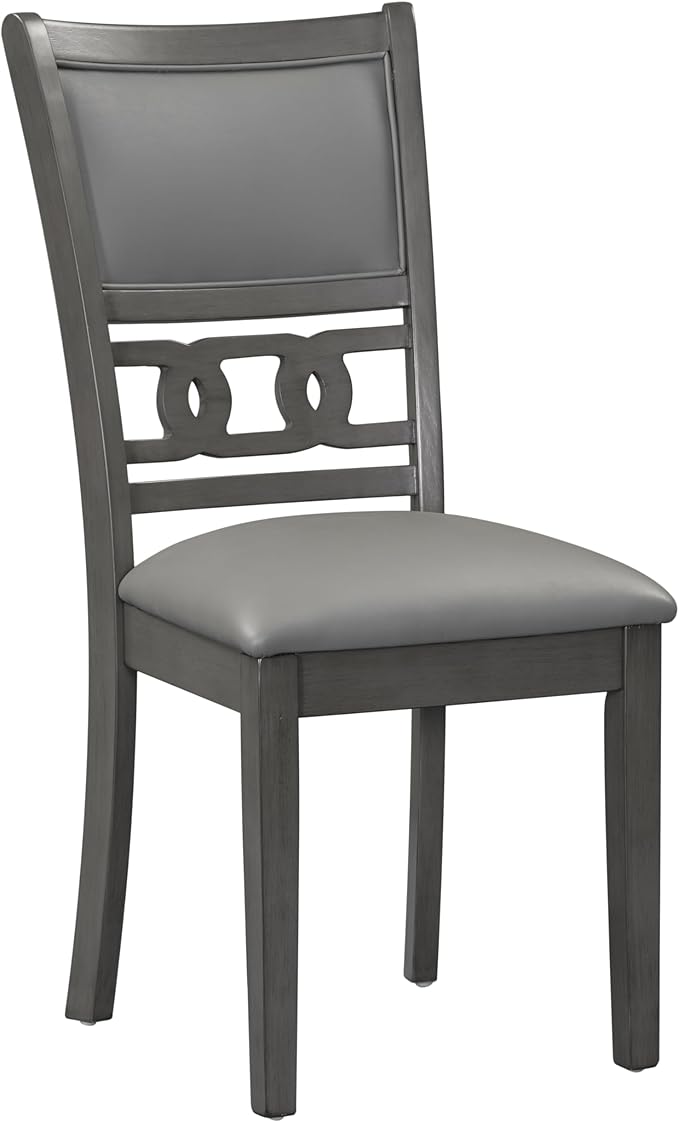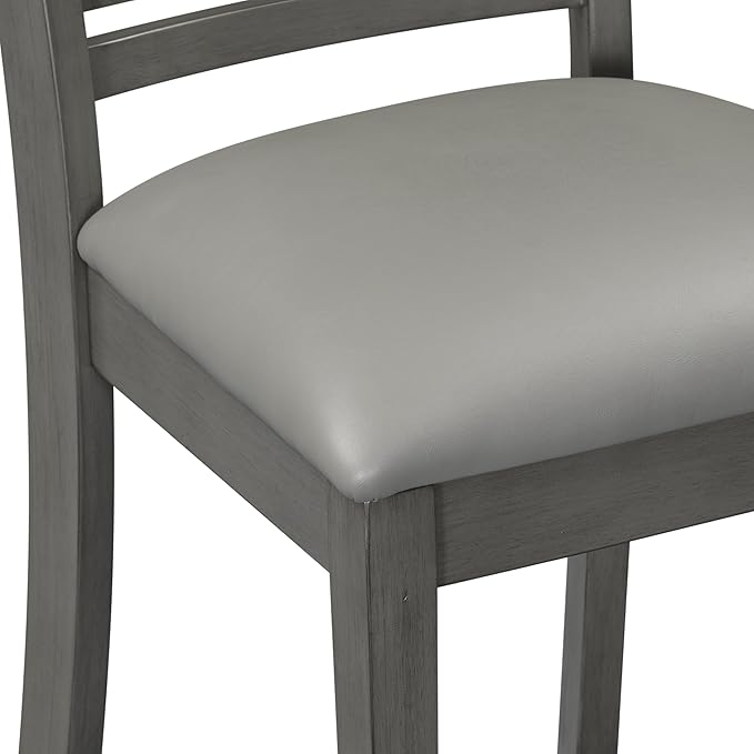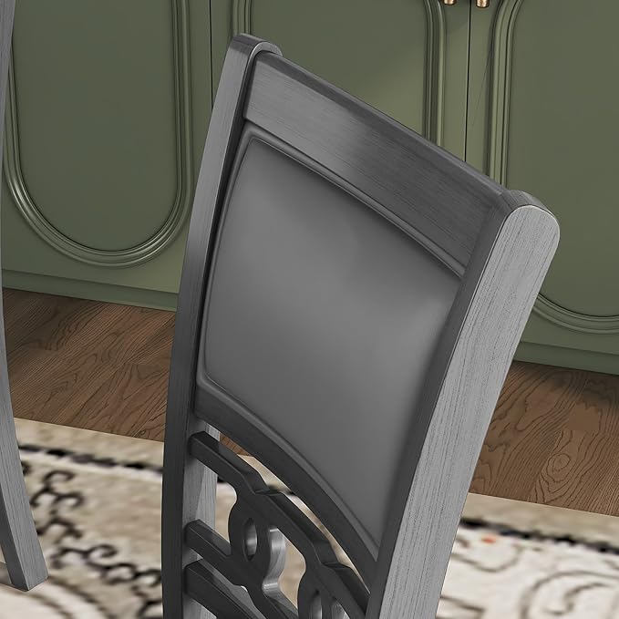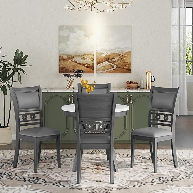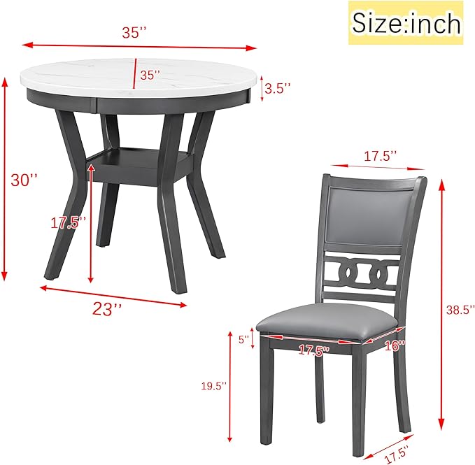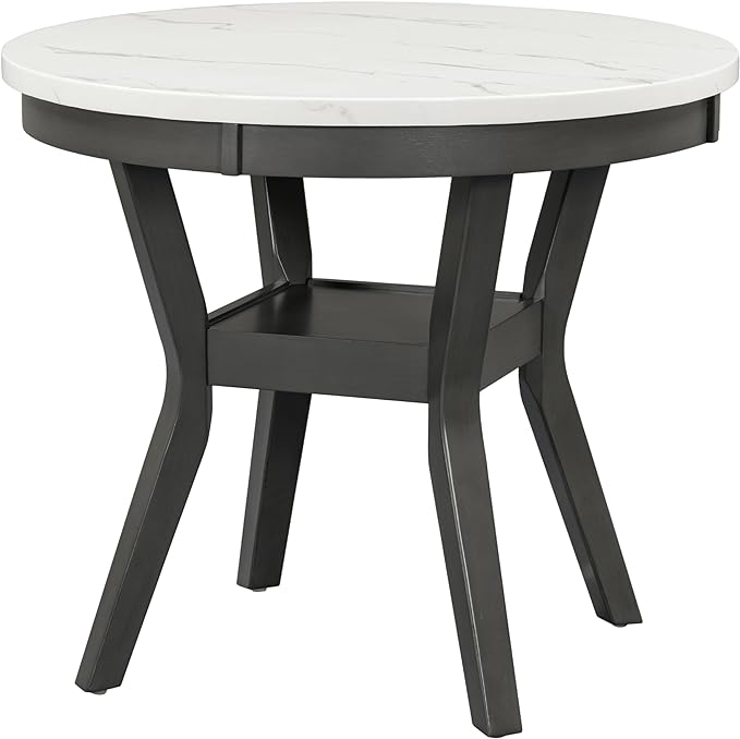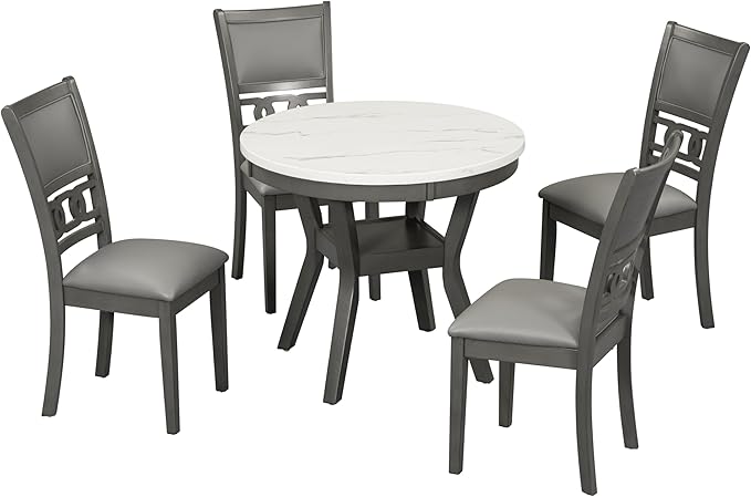5-Piece Retro Round Dining Table Set with Faux Marble Veneer and Bottom Shelf, 4 PU Leather Upholstered Chairs, for Kitchen, Breakfast Nook, Bar, Living Room, Gray, 35" L x 35" W x 30" H