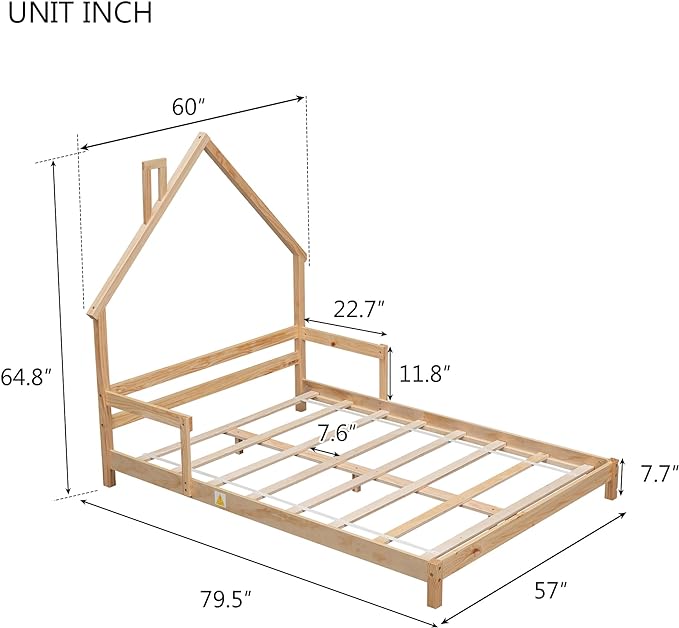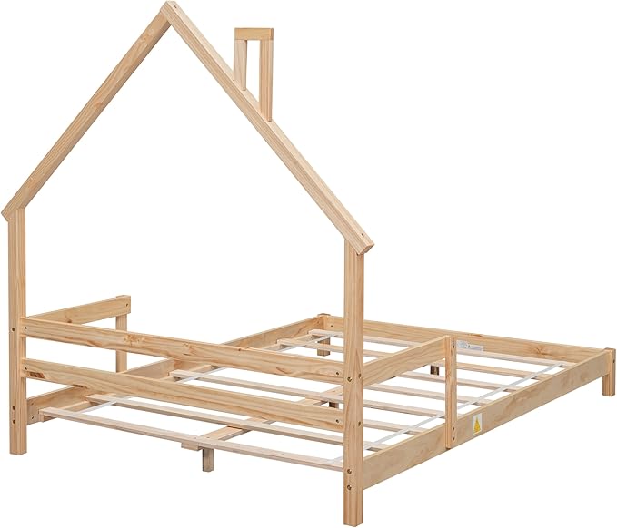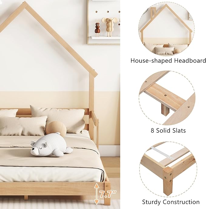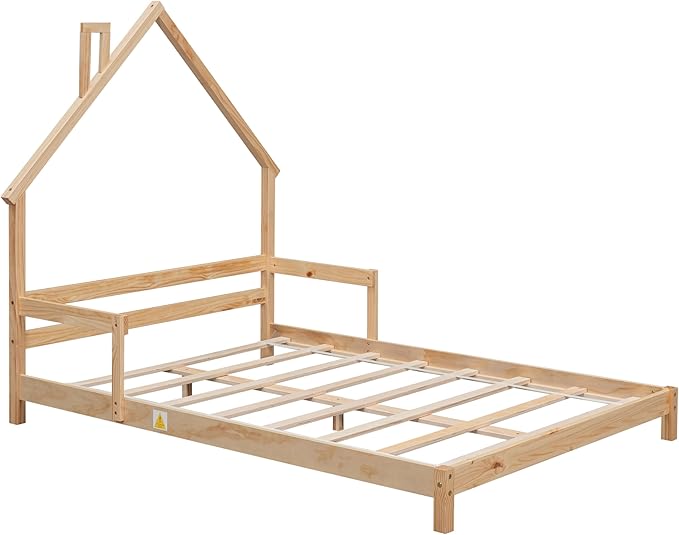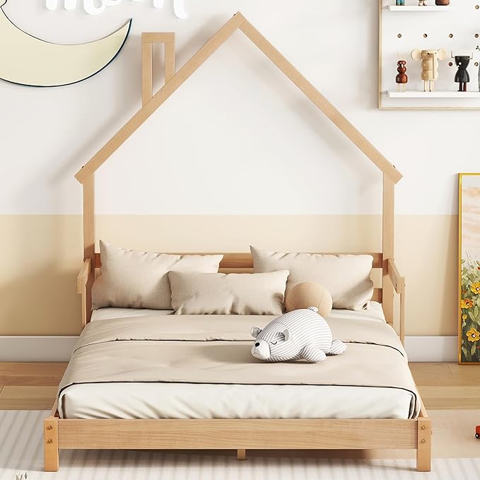 Full Size Bed Frame for Kids,House-Shaped Headboard Kids Bed,Girls Bed with Handrails,Low Platform Bed for Boys Girls,No Box Spring Needed(Natural)