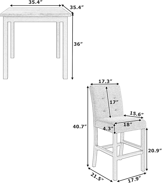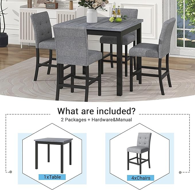 5-Piece Counter Height Dining Set, 35.4-Inch Wood Square Table and 4 Upholstered High-Back Chairs for Kitchen, Breakfast Nook, Bar, Living Room, Gray+Black, 35.4''L x 35.4''W x 36''H