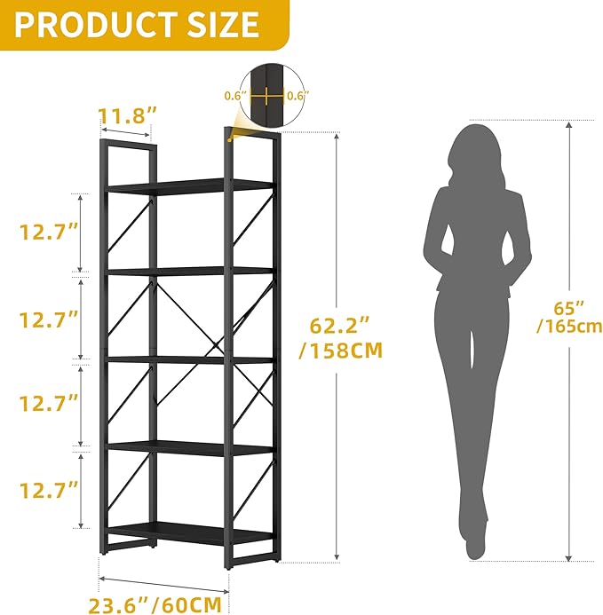 DWVO 5 Tier Bookshelf Black Bookcase, Storage Shelves Organizer Standing Shelf, Display Rack Book Shelves for Bedroom,Living Room,Office,Kitchen, Black