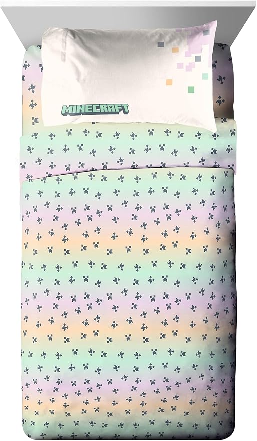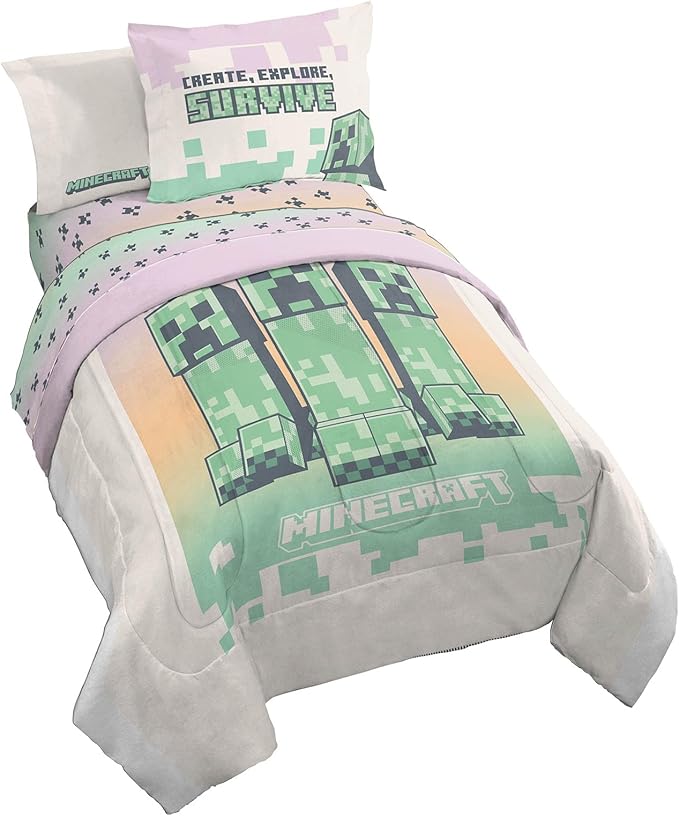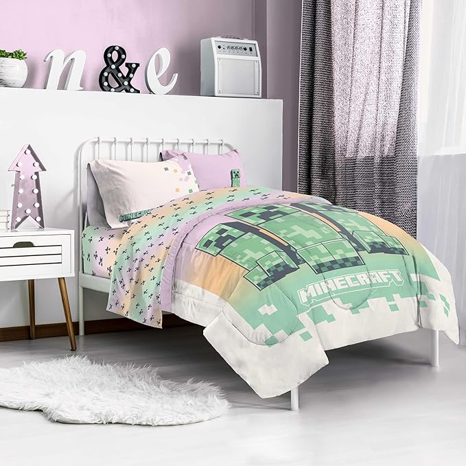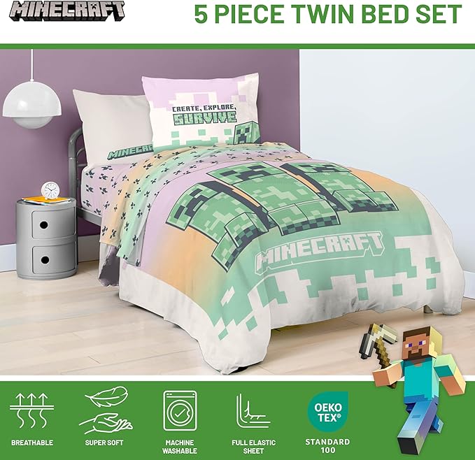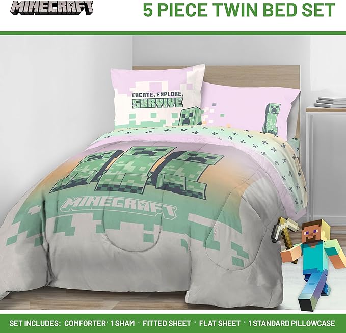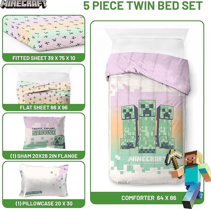 Minecraft Creeper Twin Comforter Set - 5 Piece Bedding includes Sheet Set & Pillow Covers - Super Soft Pink & Green Kids Bedding