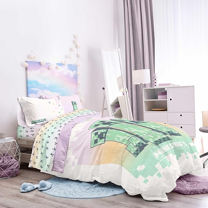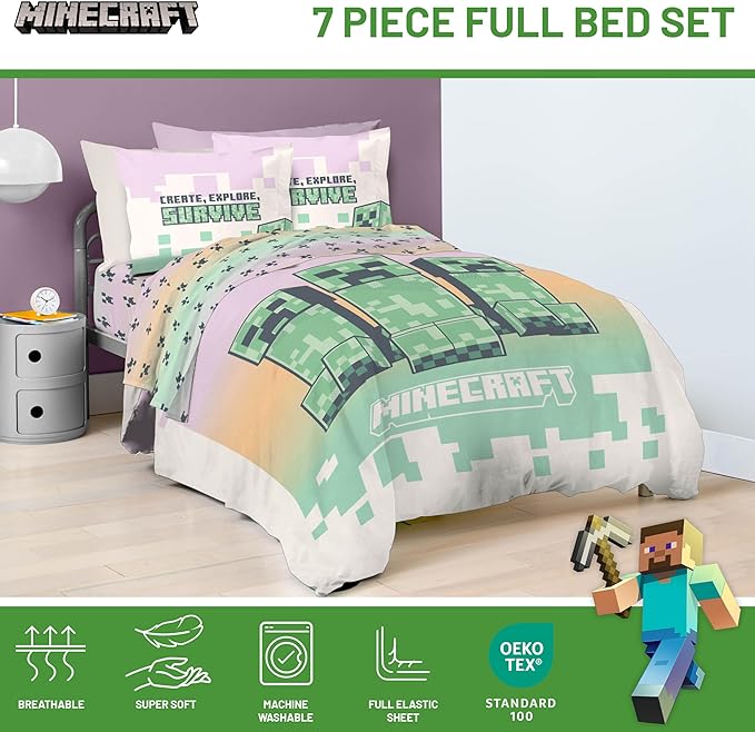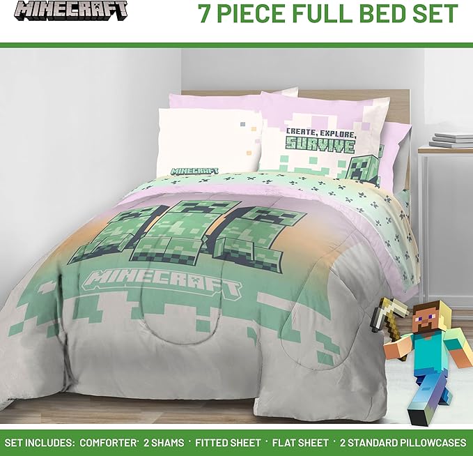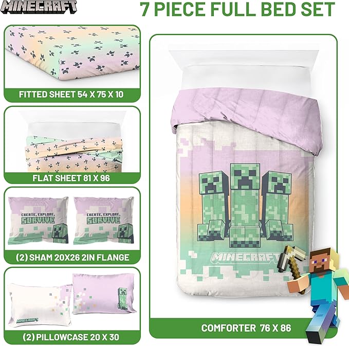 Minecraft Creeper Full Comforter Set - 7 Piece Bedding includes Sheet Set & Pillow Covers - Super Soft Pink & Green Kids Bedding