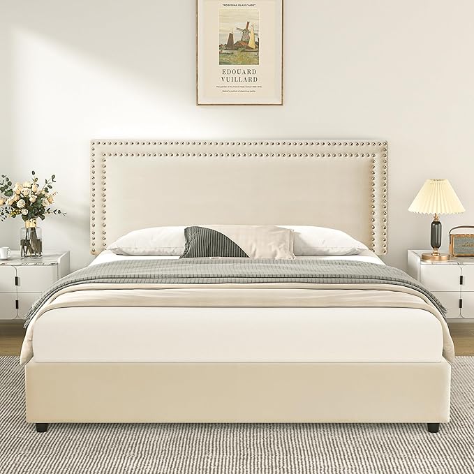 • [Adjustable Velvet Upholstered Headboard]--Featuring a stylish rivet trim, the headboard can be easily adjusted to three different heights - 40.1/42.1/44.1 inches - to perfectly fit up to 12 inch mattress. Wrapped in plush velvet and padded with a high-resilience sponge, this comfortable headboard provides a cozy and supportive surface for relaxing while reading or watching TV in bed.