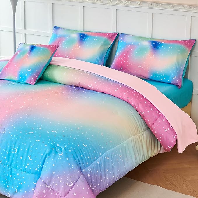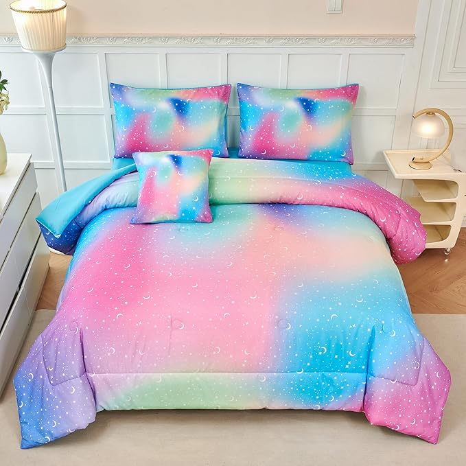 URBONUR Girls Full Bedding Set 6 Pieces Rainbow Comforter Set Full Size Multicolor Stars Printed Bed in a Bag, Soft & Fluffy Kids Bed Sets