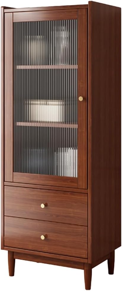 Wooden Glass Door Bookcase - 3-Tier Cube Bookshelf Storage Cabinet with Double Drawer and Adjustable Shelf, Solid Wood Legs Cupboard in Dark Walnut