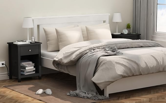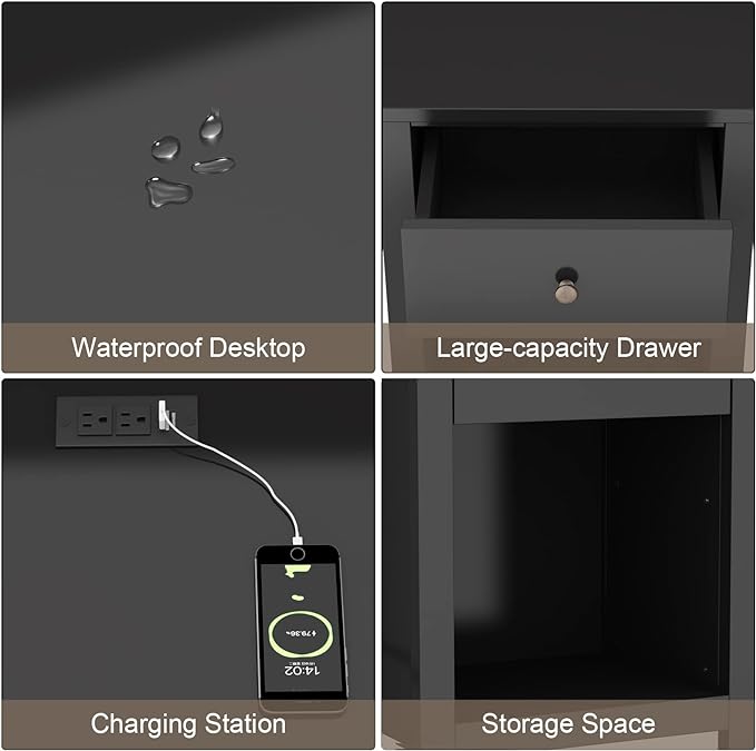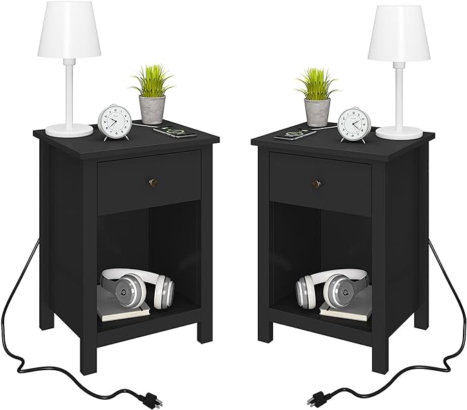 ChooChoo Black Nightstand Set of 2,Night Stand with Charging Station, Wooden Top Bedside End Table with Drawer and Storage Space for Bedroom