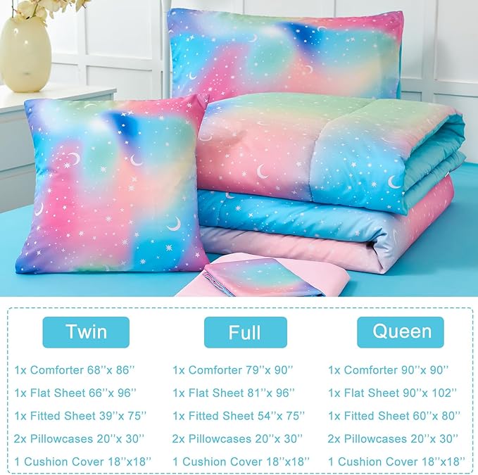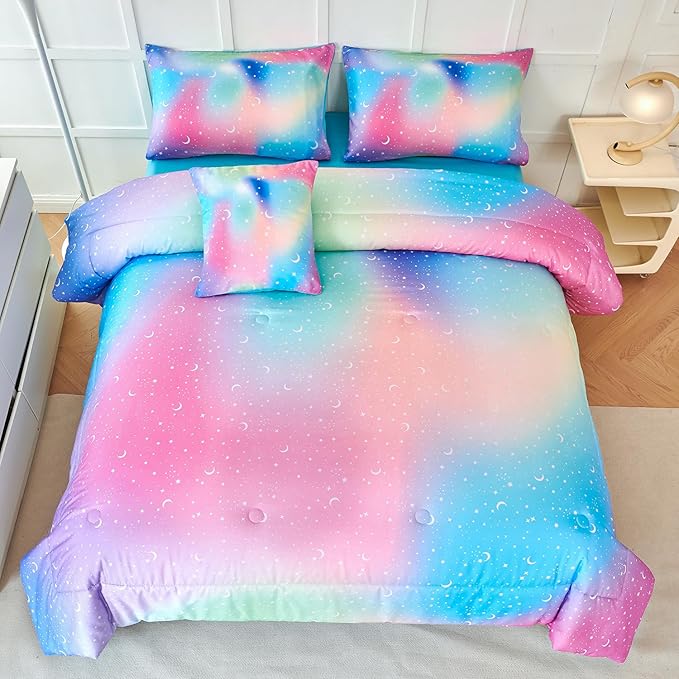 URBONUR Kids Bedding Set Twin Size 6 Pieces Comforter & Sheet Set Colorful Rainbow Tie Dye Stars Printed Girls Bedding Set Ultra Soft Bed Sets