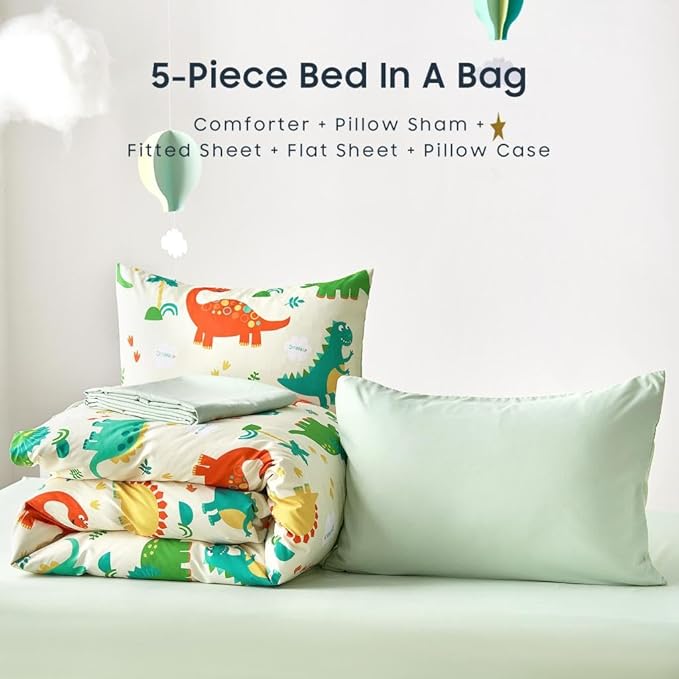 Wake In Cloud - Dinosaur Bedding Set for Boys, Cute Colorful Dinosaur Comforter Set with Sheets, 5 Pieces Kids Bed in a Bag, Cream Green, Twin Size