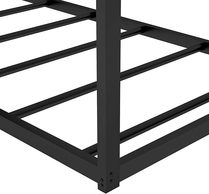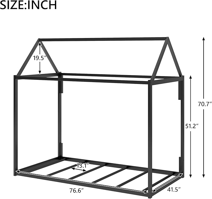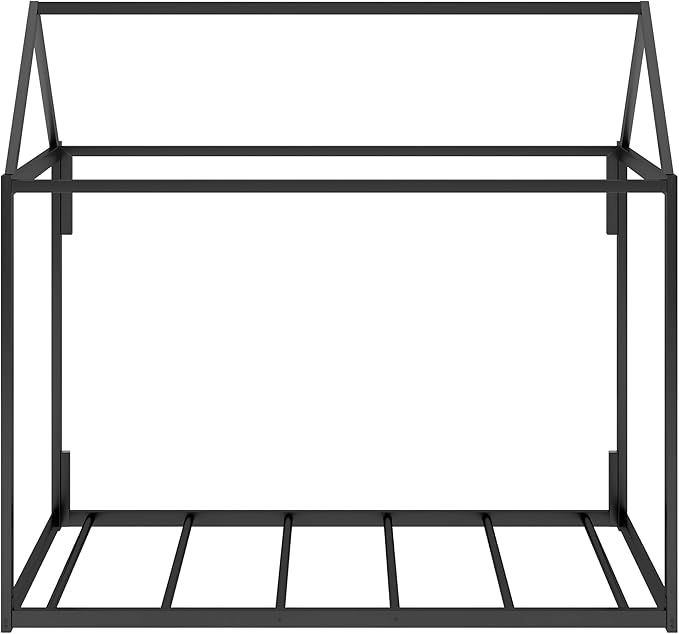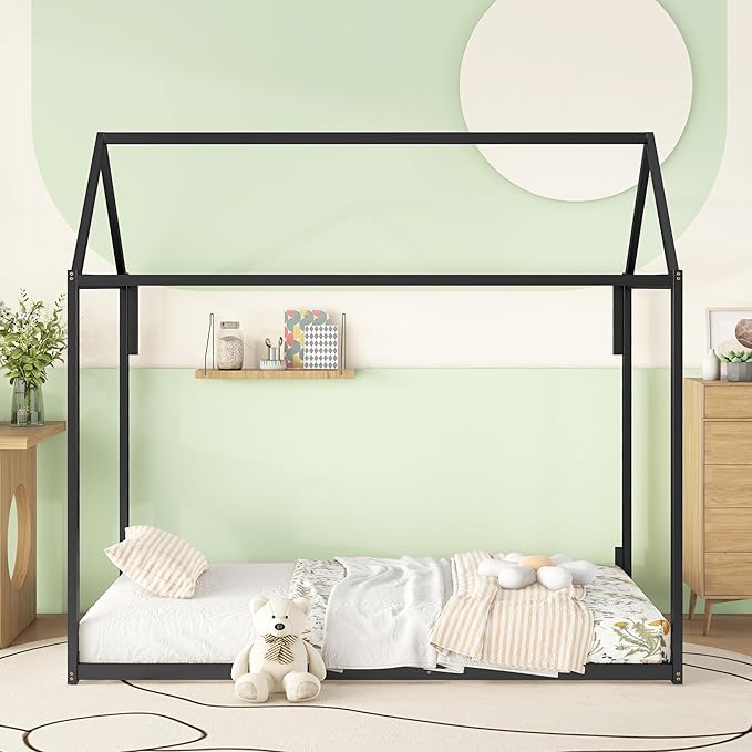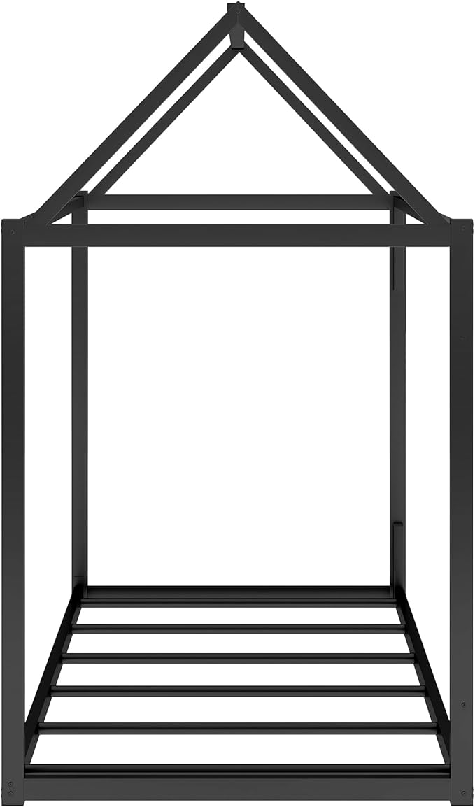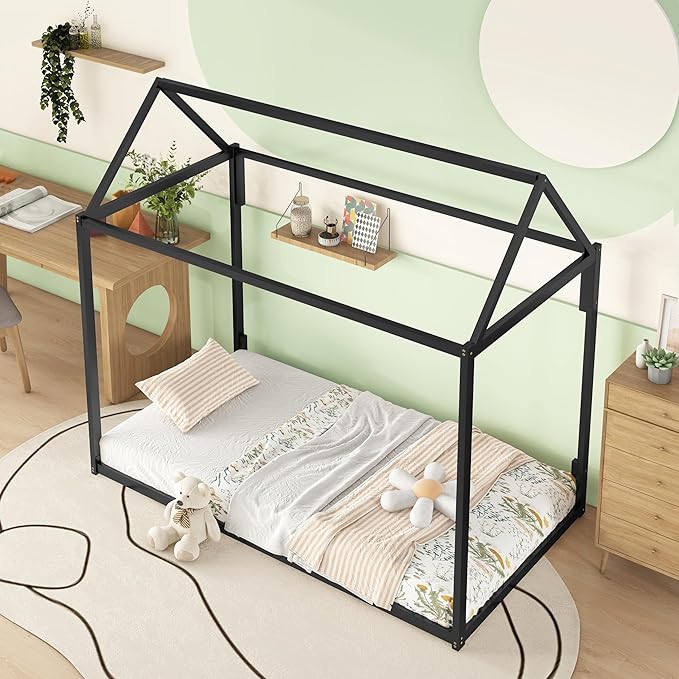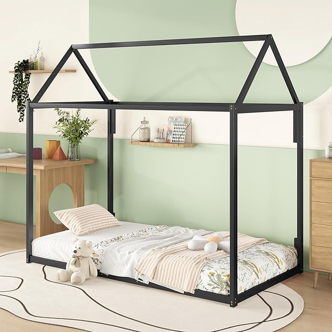 Metal Twin Size Montessori Floor Bed for Kids,Floor Bed Twin,House Bed with Slats for Boys Girls,Metal House Shape Platform Bed,No Spring Box Required,Black