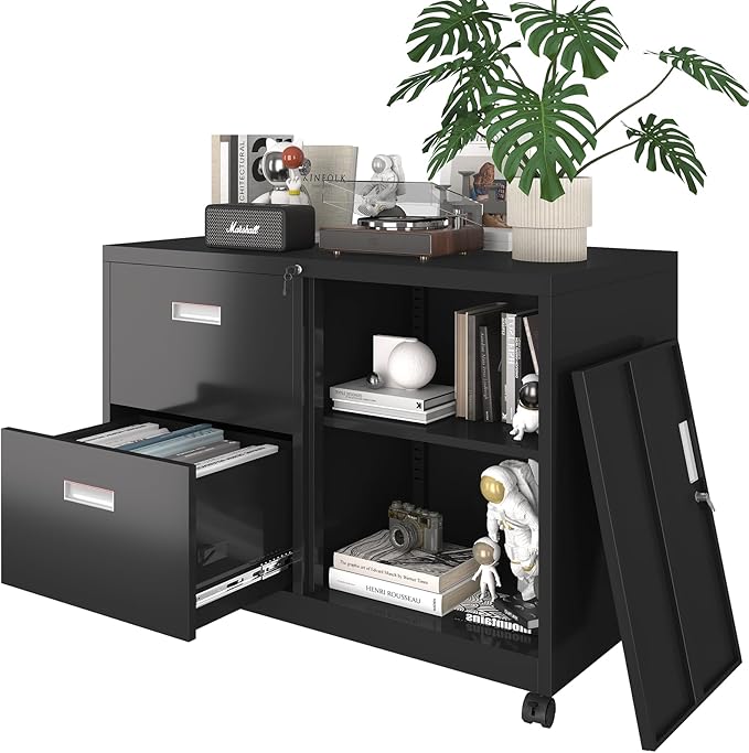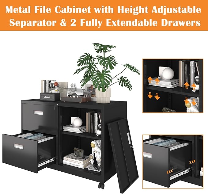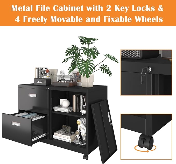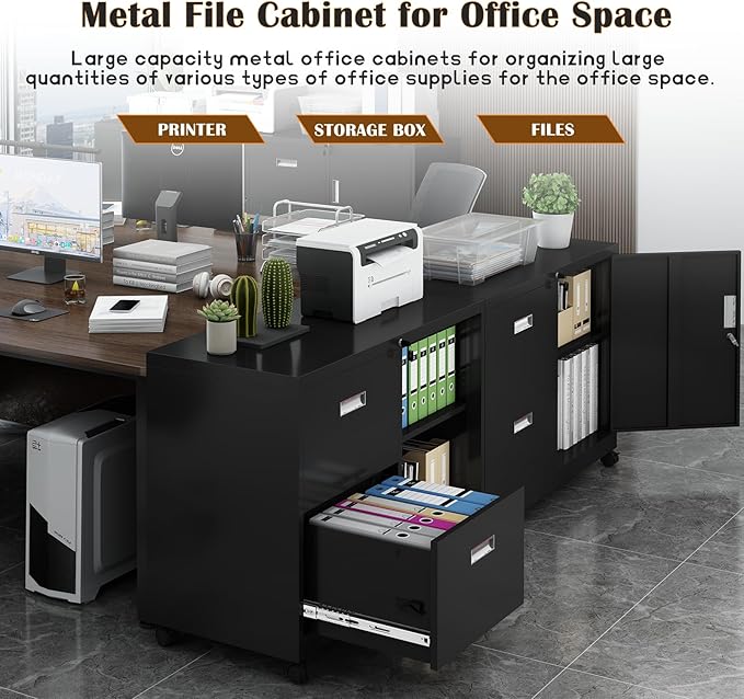 Metal File Cabinet Printer Stand with 2 lockable full extension drawers and 1 lockable door, adjustable shelf, for Home office and Study room Organizer Letters/Legal/A4,BLACK