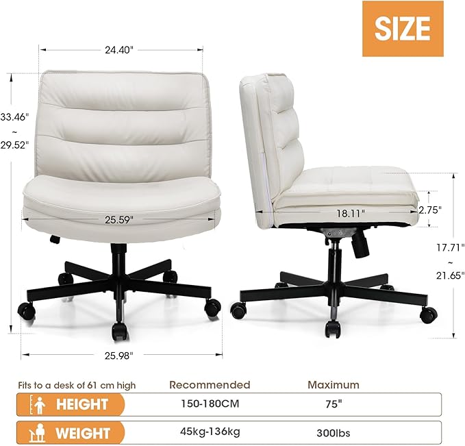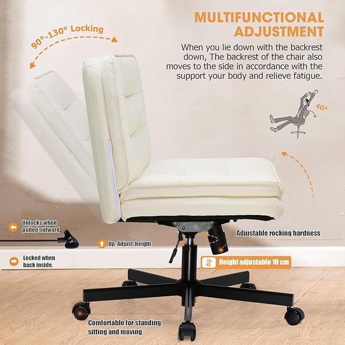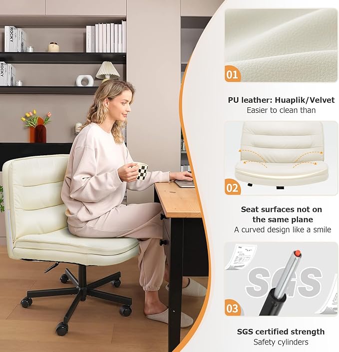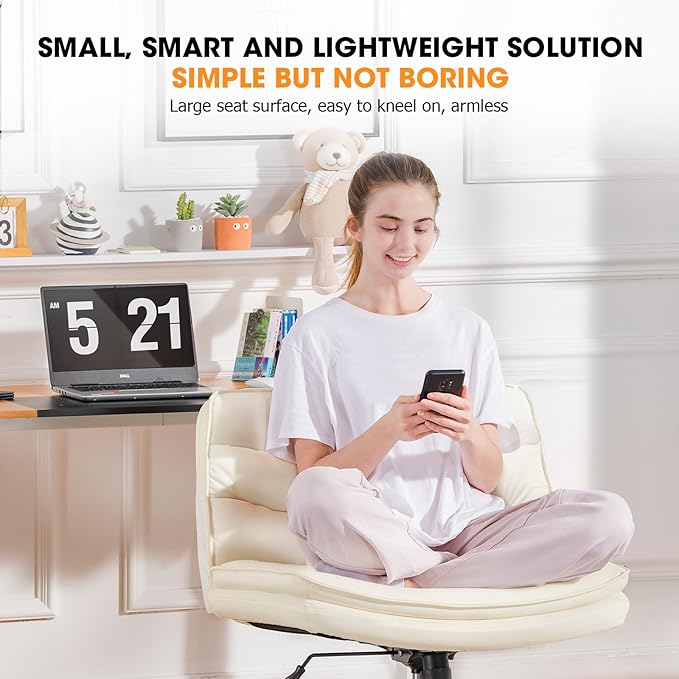 COMHOMA Criss Cross Chair with Wheels, Armless Wide Cross Legged Office Chair Mid Back, Modern Home Office Desk Chair Swivel Adjustable Vanity Computer Chair, Beige