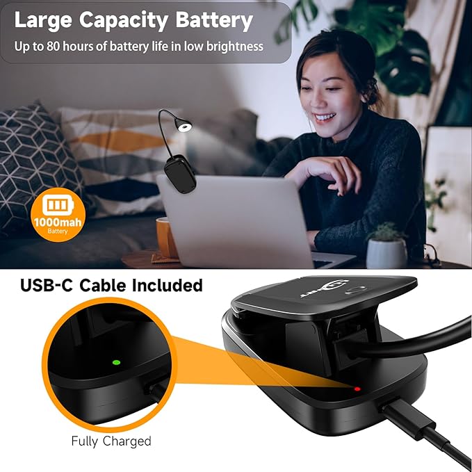 Book Lights for Reading in Bed, 12 LEDs Rechargeable Battery Clip Lamp with 3 Lighting Color, Stepless Dimming, Eye Protection, 80 Hours Runtime, 360° Flexible Gooseneck, Lightweight, Portable