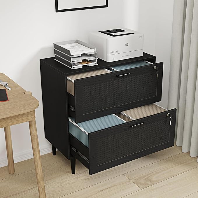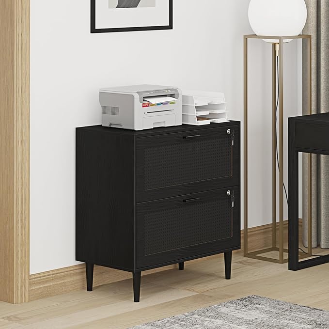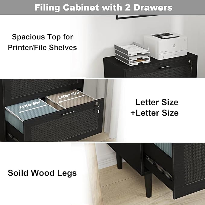 2 Drawer File Cabinet, Lateral File Cabinet with Lock, Rattan Wood Filing Organization Cabinet for Home Office, Black