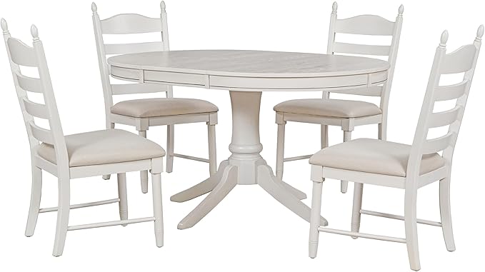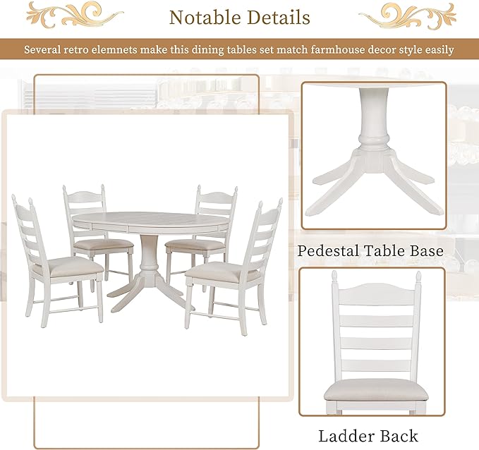 Dining Table Set for 4 Person, 5 Pieces Kitchen Table&Chairs Including Round Extendable Diningtable and Four Upholstered Chairs, Wood Grain Tabletop, Ladder Backrest, Solid Wood Rubber Legs