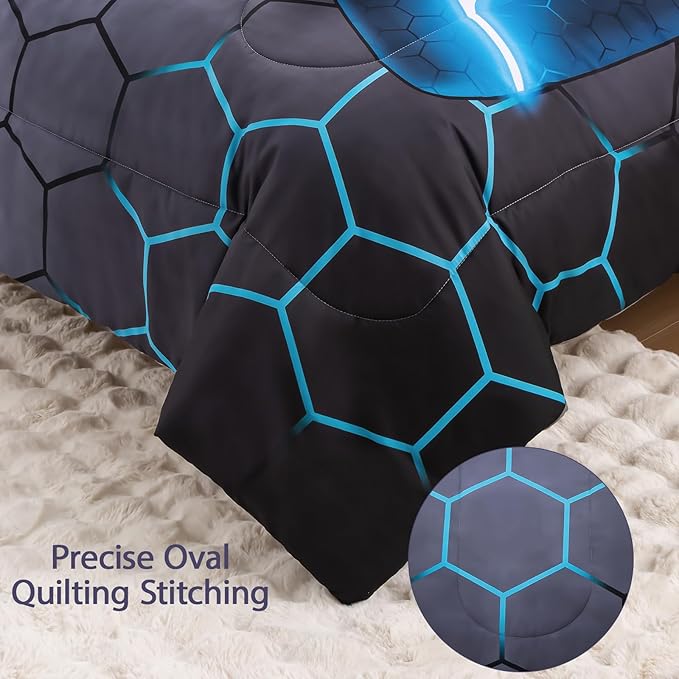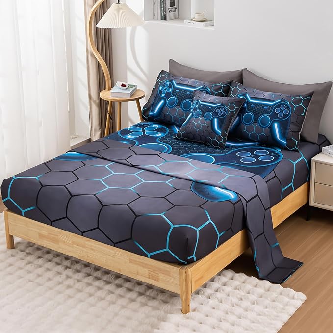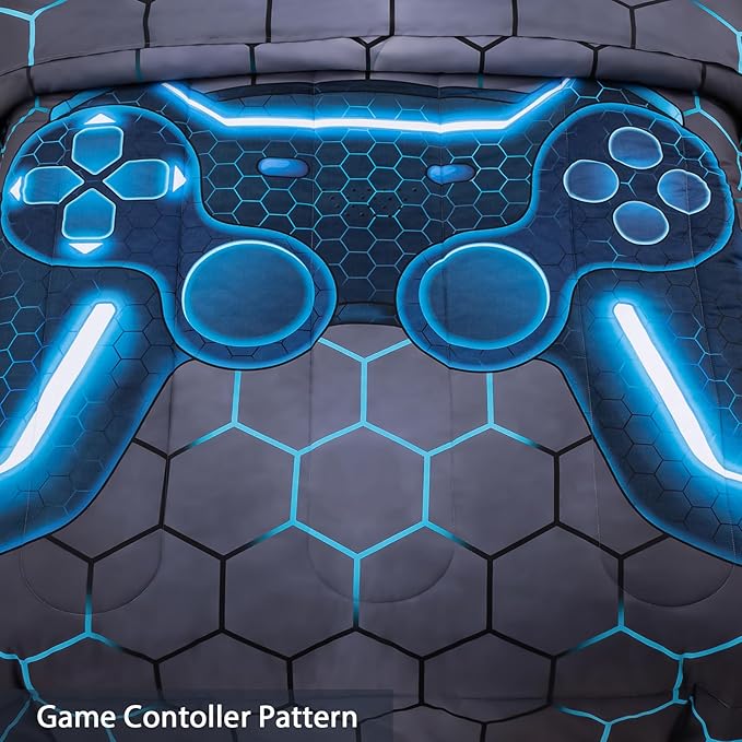 8Pcs Game Console Comforter Set with Sheets for Boys Girls Kids Teens, Geometric Gaming Themed Bed in A Bag Twin Size, Blue 3D Video Gamer Controller Bedroom Decor Bedding Set-Blue