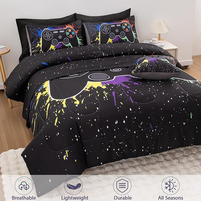 About This ๐ฎ[Game Controller Design]: 3D video game controller comforter with rainbow splatter colors, making it a piece of artistic...