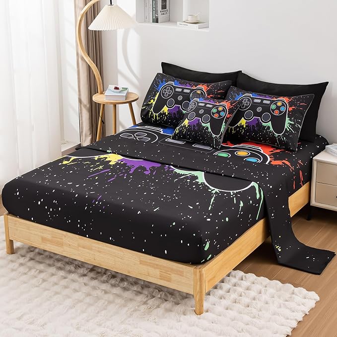 8Pcs Gamer Comforter Set with Sheets for Boys Girls Kids Teens, Colorful Graffiti Gaming Themed Bed in A Bag Twin Size, Black 3D Video Game Controller Bedroom Decor Bedding Set-Black