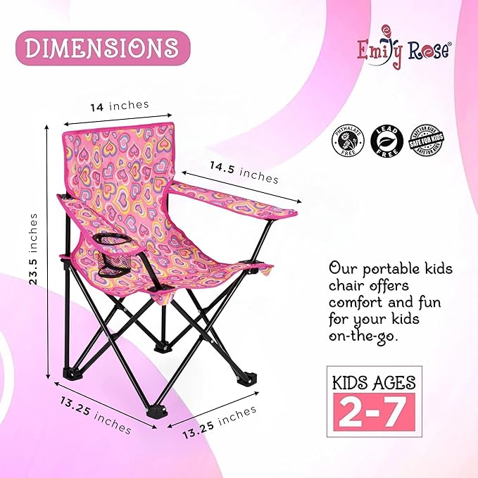 Emily Rose Kids Folding Chair | Beach Chair with Safety Lock- Camping Chair for Boyos Girls Toddler with Cup Holder & Carry Case- Tailgate, Travel, Lawn- for Indoor & Outdoor (Playful Hearts)