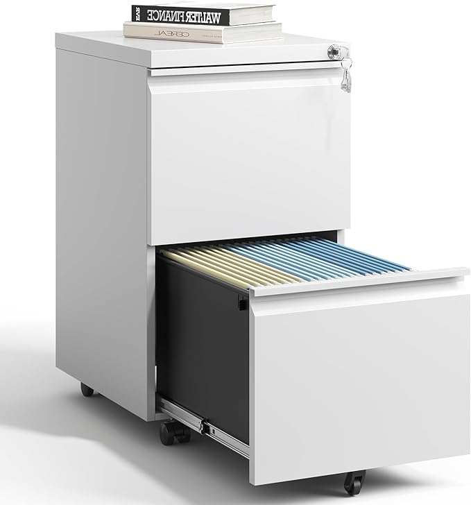 2 Drawer Mobile File Cabinet with Lock,Under Desk Metal Filing Cabinet for Home Office, Metal Small Rolling File Cabinet with 2 Keys for Legal/Letter/A4 Size Fully Assembled Except Wheels (White)
